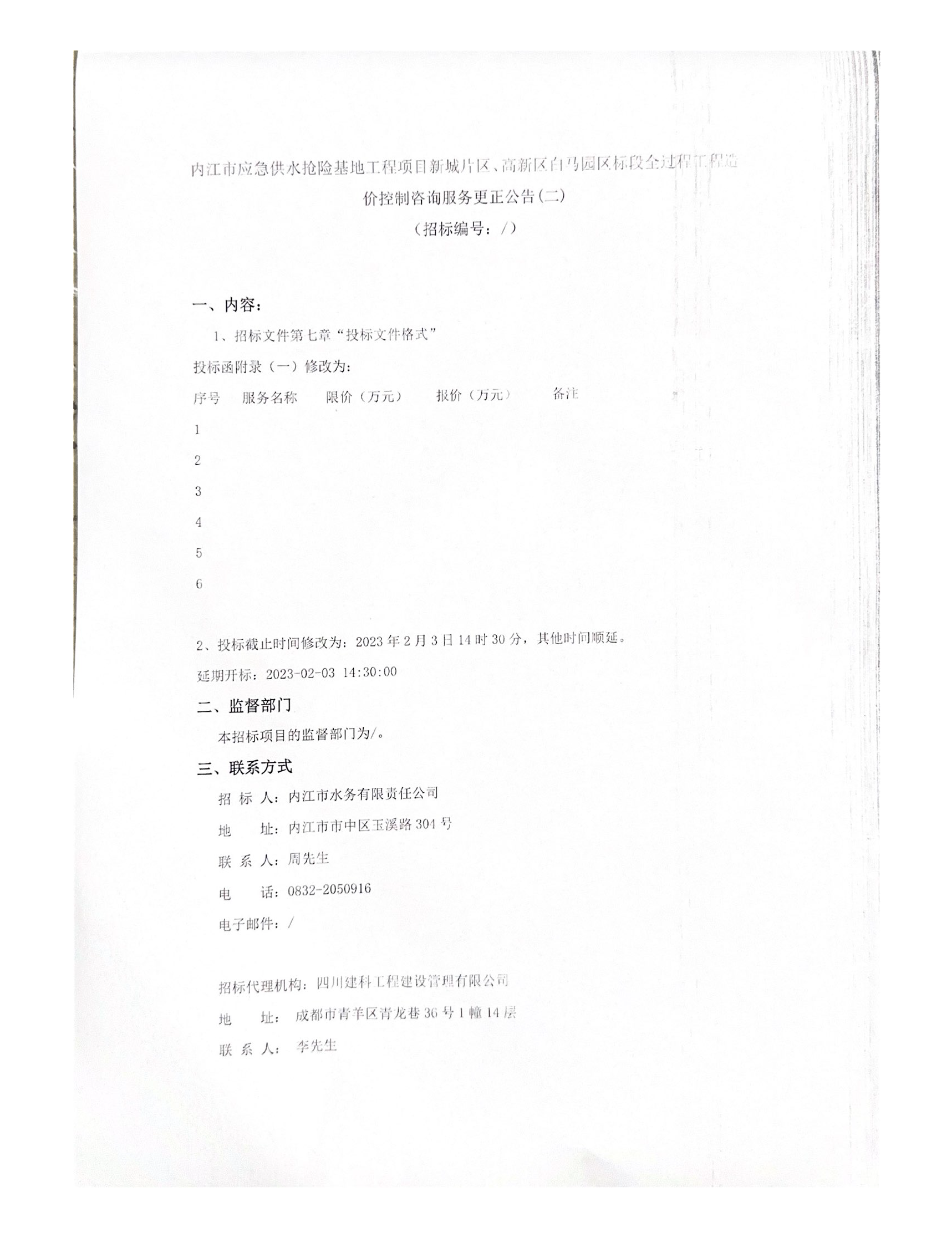 內(nèi)江市應急供水搶險基地工程項目新城片區(qū)、高新區(qū)白馬園區(qū)標段全過程工程造價控制咨詢服務更正公告(二)