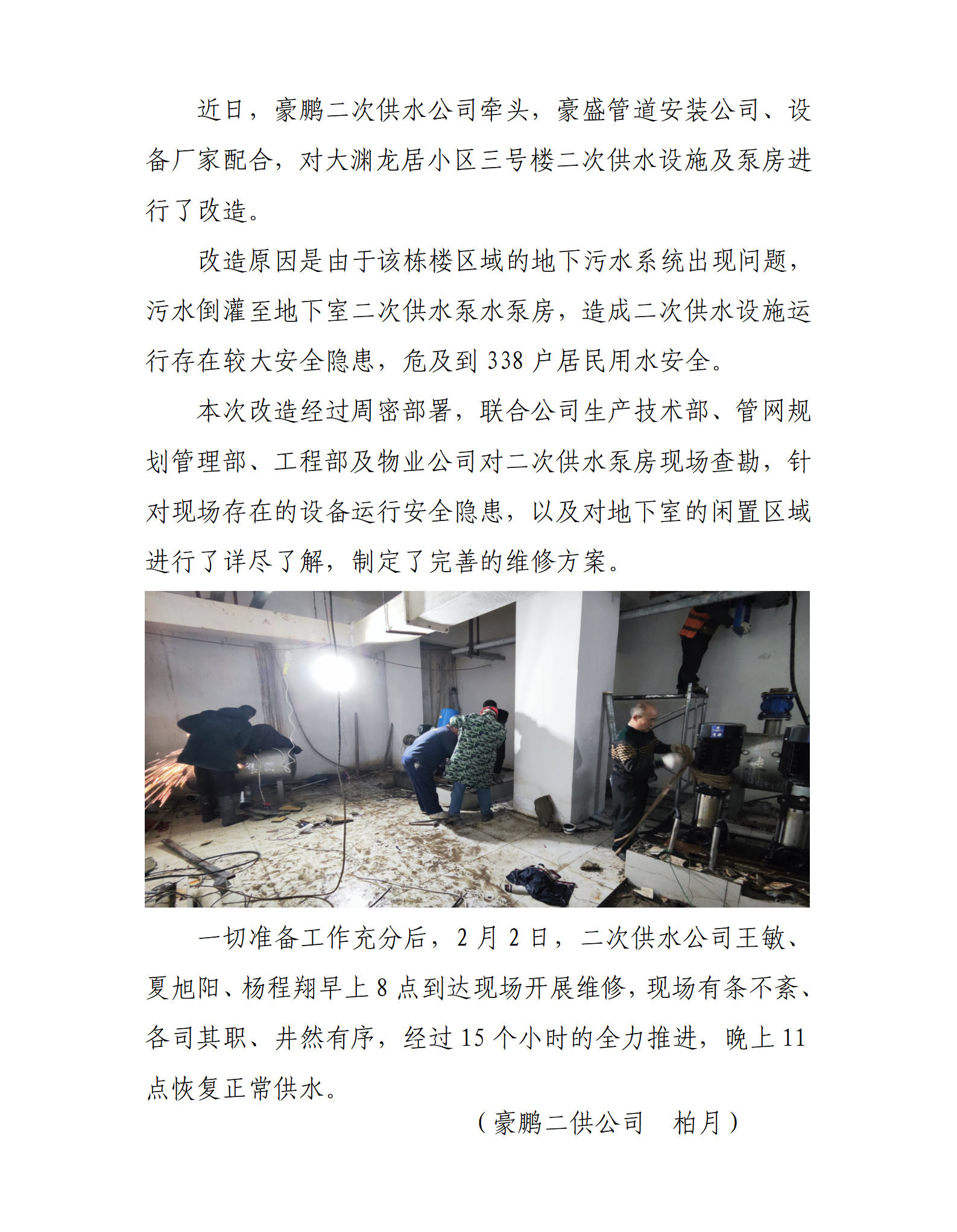 豪鵬公司牽頭對大淵龍居小區(qū)二次供水設施及泵房進行改造
