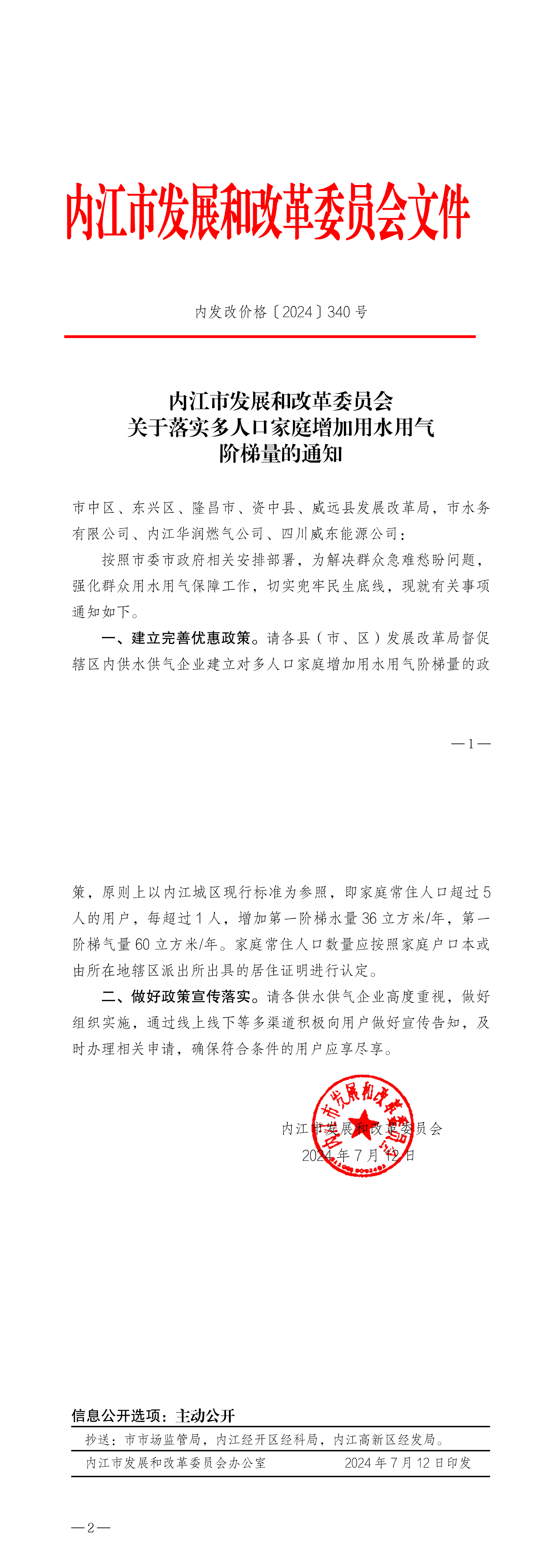 內(nèi)江市發(fā)展和改革委員會(huì)關(guān)于落實(shí)多人口家庭增加用水用氣階梯量的通知